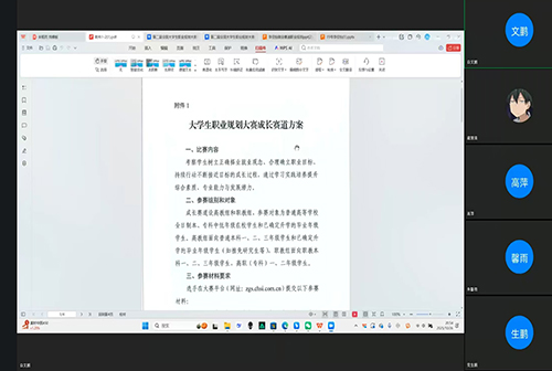 为明确大赛要求与规则,帮助我院学生掌握备赛技巧,10月27日,我院在钉钉会议开展第三届职业规划大赛线上培训会议,本次会议由我院第二届嘉立荷杯职业生涯规划大赛优秀参赛选手向莉娟、藏慧清主讲,我院部分研究生、本科生参加,分团委·学生会就创部负责人白文鹏、王译晨主持。