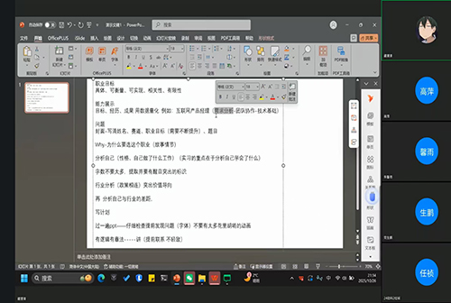 白文鹏详细讲解赛道划分标准与材料提交要求,并结合优秀PPT案例,帮助参赛者梳理创作思路与逻辑,为赛事筹备提供了有力支撑。随后,向莉娟、藏慧清结合自身参赛经验展开指导,她们围绕职业选择、政策分析、PPT及策划书制作规范等核心内容,明确职业选择需紧扣专业方向,同时详细传授演讲稿撰写技巧与现场演讲要点,帮助参赛学生清晰把握备战方向。最后,王译晨对本次会议进行总结,她鼓励同学们以积极心态投入备战,不断提升职业规划能力,明确自身未来职业发展方向。