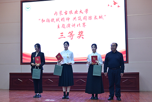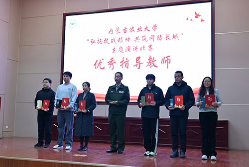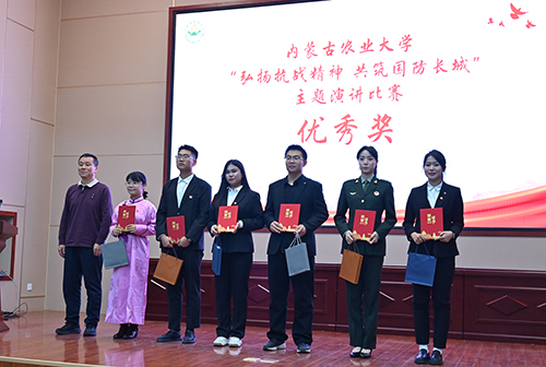 分数统计环节,我院学生靳建婕带来歌曲《有我》,用嘹亮的歌声传递青春担当,赢得全场阵阵掌声。比赛最后,任祯、顾悦妍宣读获奖名单,其中,草业学院刘明昊荣获一等奖,园艺与植物保护学院马越、人文与社会科学学院吴鑫玥荣获二等奖,动物科学学院王叶萱、经济管理学院薛彬兵、理学院王娅齐荣获三等奖,林学院乌力雅苏、水利与土木建筑工程学院侯云天、机电工程学院王建海、生命科学学院吴思涵、食品科学与工程学院王慧、沙漠治理学院寇晓清荣获优秀奖,园艺与植物保护学院张晓艳、人文与社会科学学院苏日巴特、经济管理学院苏宁巴乐、草业学院刘李杰、理学院包乌云、动物科学学院燕人嘉荣获优秀指导教师称号,在场评委为获奖者颁奖并合影留念。